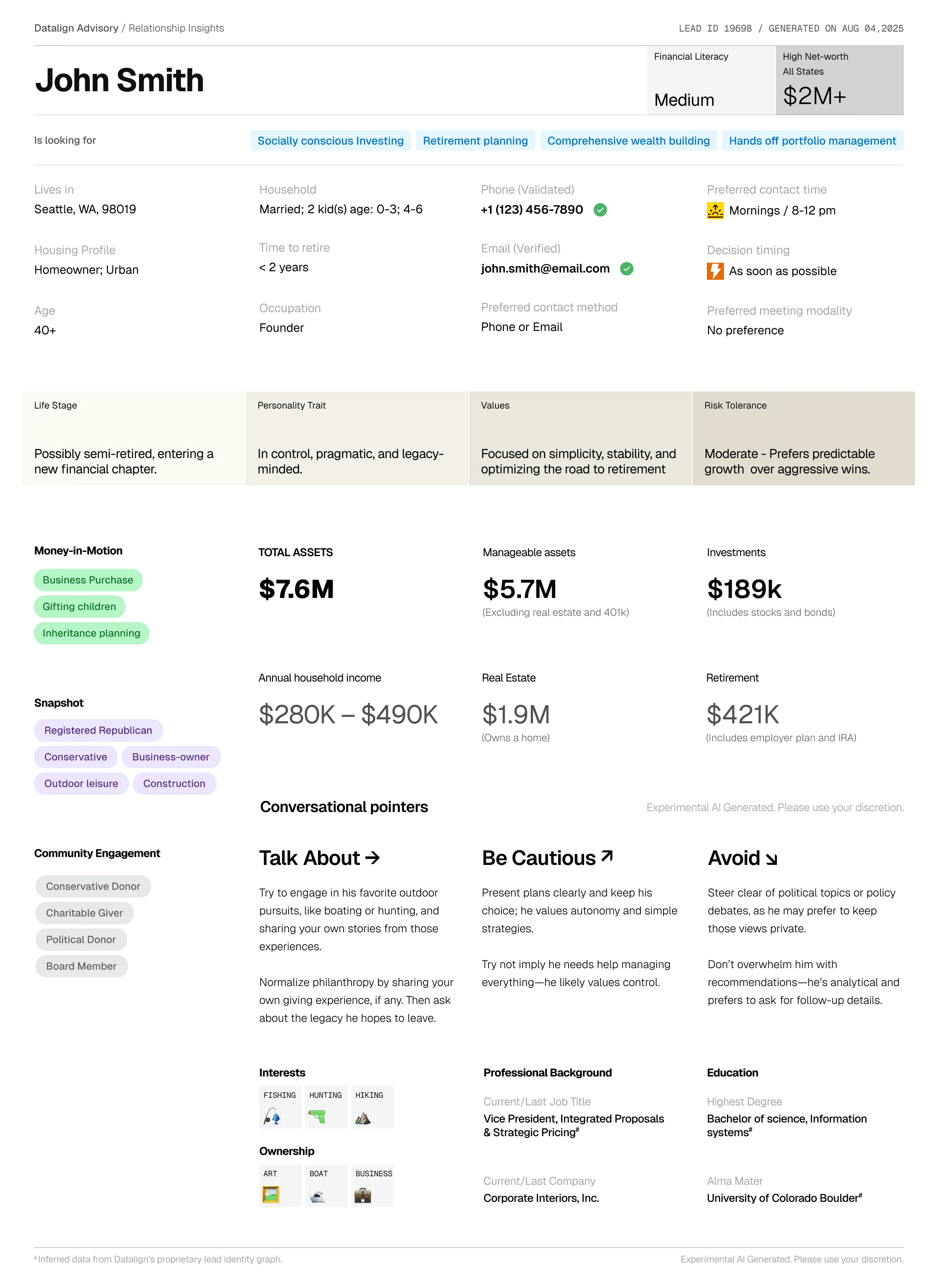 Each prospect profile synthesizes hundreds of data points into clear, practical insights across four key categories: demographic details and professional background, wealth indicators (money-in-motion events) and financial readiness, lifestyle interests and behavioral patterns and personalized conversation starters with communication preferences. These insights help you understand not just who your prospect is, but how to connect with them in the most meaningful way.