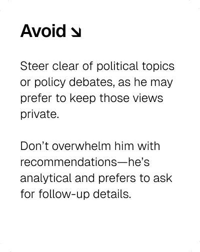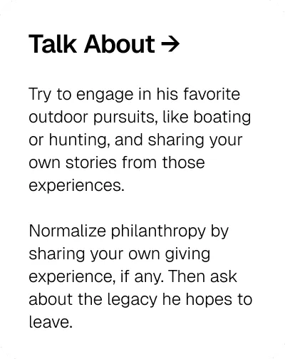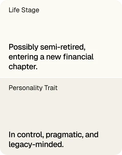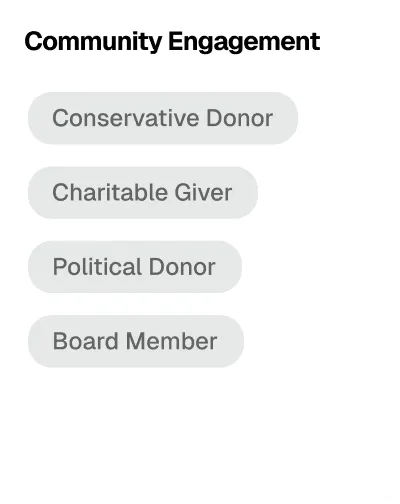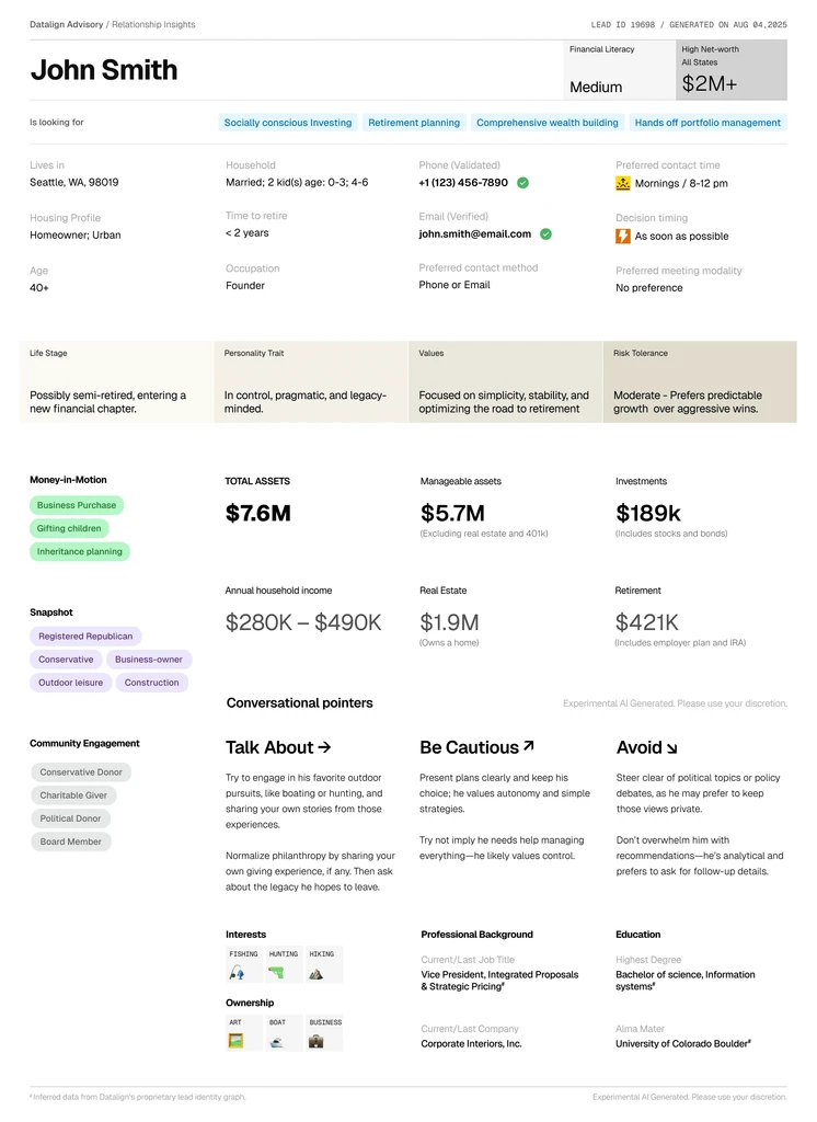 Each prospect profile synthesizes hundreds of data points into clear, practical insights across four key categories: demographic details and professional background, wealth indicators (money-in-motion events) and financial readiness, lifestyle interests and behavioral patterns and personalized conversation starters with communication preferences. These insights help you understand not just who your prospect is, but how to connect with them in the most meaningful way.